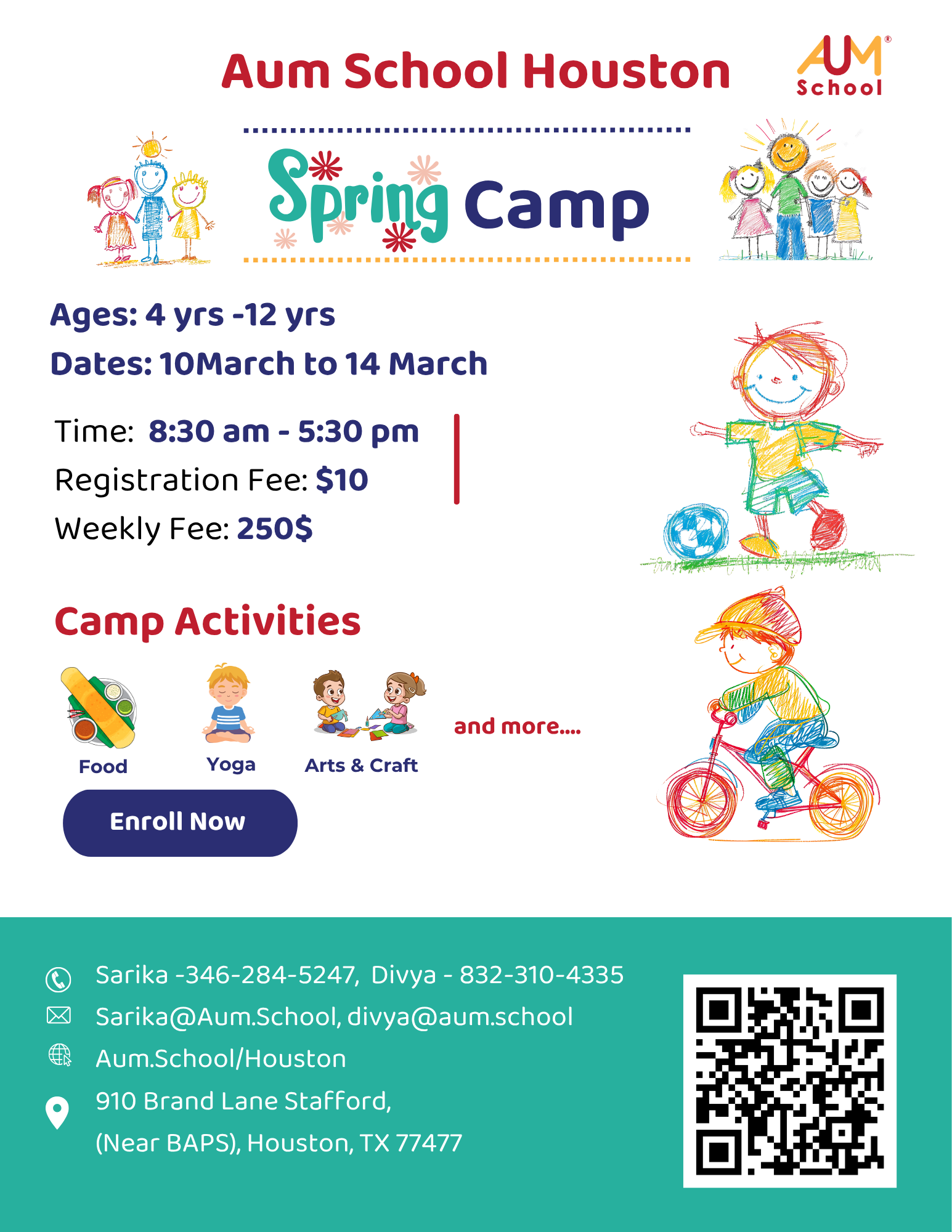 This flyer was designed to promote the fun and engaging side of Aum School’s Spring Camp 2025. Using hand-drawn illustrations, bold headings, and vibrant icons, it highlights